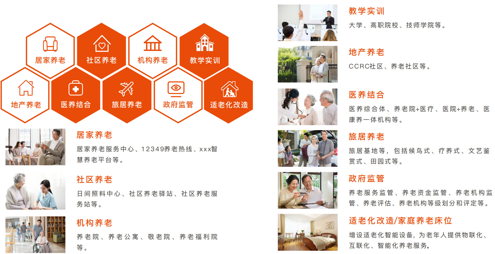 1、養老運營模式:居家養老、機構養老、社區養老、地產養老、醫養結合、旅居養老。